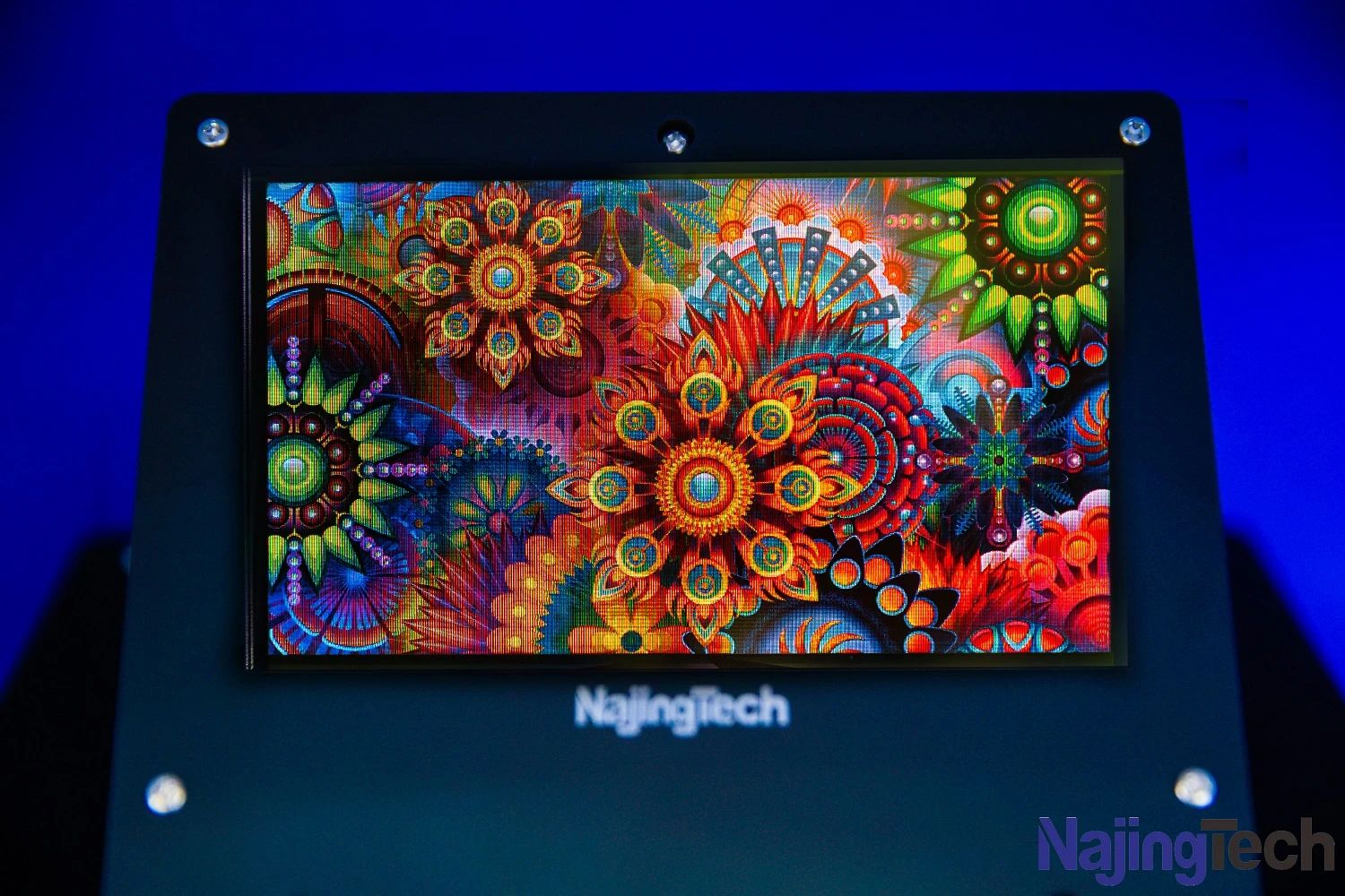 納晶首次展出的5.5英寸150ppi噴墨打印AM-QLED顯示屏,與(yu)量子點光致發光技術不同(tong)的是,AM-QLED顯示(shi)屏基于量子(zi)點(dian)“電致發光”原理,無(wu)需(xu)背(bei)光源,實現真正的“主動式量子點自發光(guang)全彩顯示”。這款DEMO的峰值(zhi)亮度可(ke)達(da)1000nit,色(se)域(yu)達到(dao)115% NTSC,吸引了(le)眾(zhong)多觀(guan)眾(zhong)駐(zhu)足參觀(guan)。